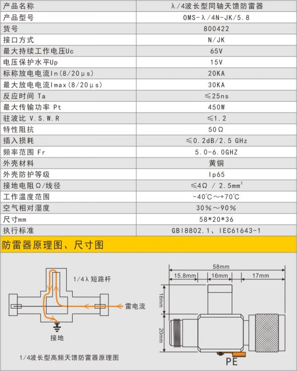 1/4波長(zhǎng)型5.8G天饋電涌保護(hù)器(天饋避雷器、天饋防雷器)OMS-λ/4N-JK/5.8-