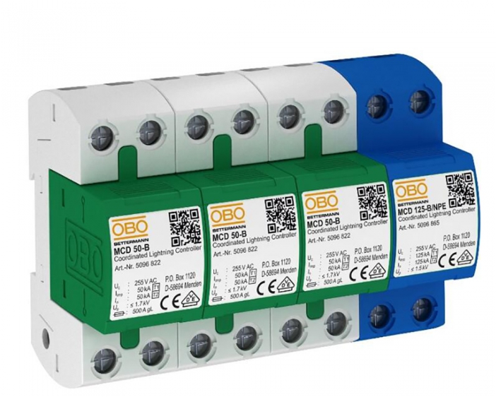 MCD 50-B以其低保護電壓水平(Up<1.3KV)的特性,確保了與C級防雷器的配合使用時不需要設計退耦裝置也不需要在B級與C級之間留