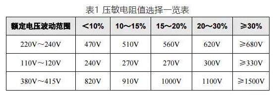 壓敏電阻的壓敏電壓值可參考表1選取,壓敏電壓值可以適當(dāng)選高一點(diǎn),這樣更安全、耐用,故障率低,但殘壓略高。然后根據(jù)通流容量要求選擇外形尺寸和封裝形式,或采用幾個(gè)壓敏電阻并聯(lián),注意應(yīng)挑選壓敏電壓值相近的并聯(lián),每個(gè)壓敏電阻都要單獨(dú)串聯(lián)溫度保險(xiǎn)管,以延長(zhǎng)使用壽命和確保安全。